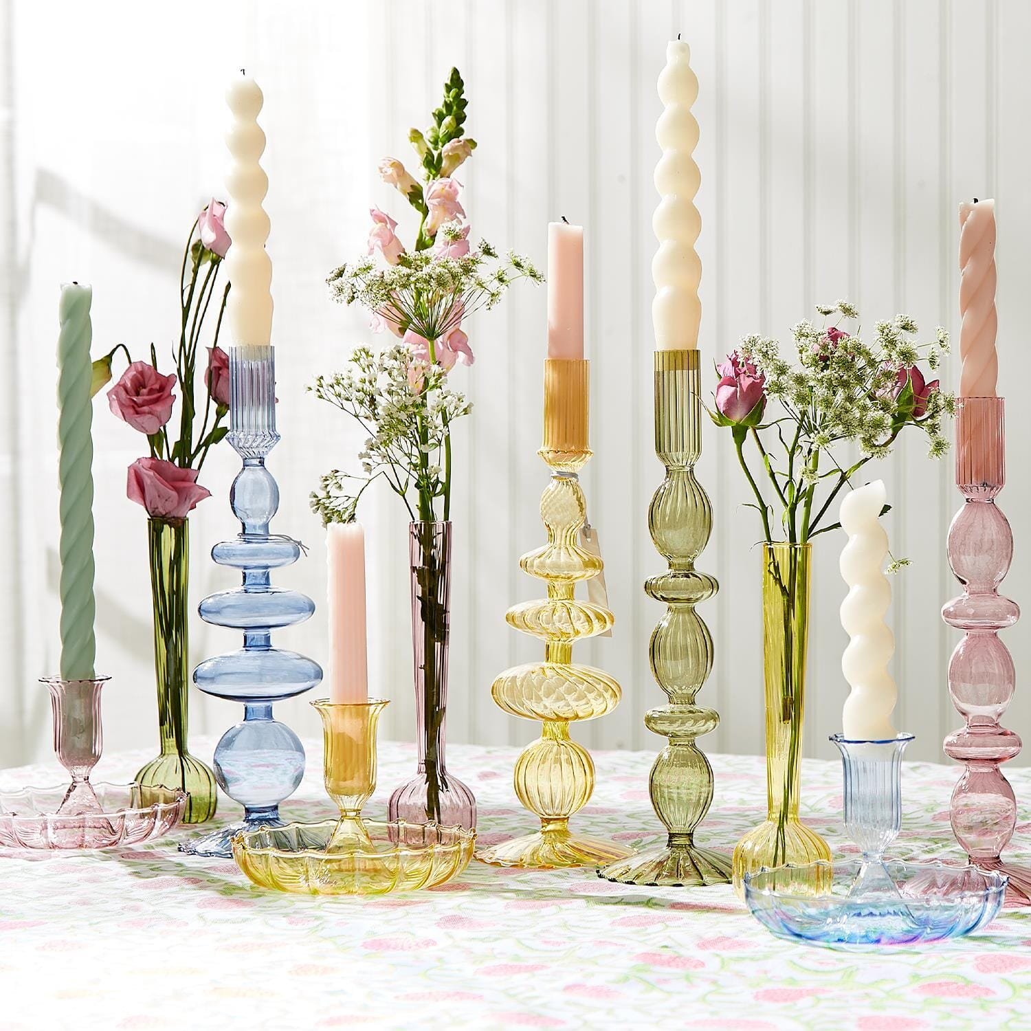 Set of 5 includes 5 styles in 5 different colors. Each candle holder is meticulously hand blown by skilled artisans, resulting in individual pieces that showcase the beauty of craftsmanship and attention to detail. The set includes five distinct designs, making each candle holder a standalone work of art. Whether placed on a dining table or a mantelpiece, they infuse your space with warmth and charm. Their timeless appeal makes them a versatile decor choice for any room in your home.